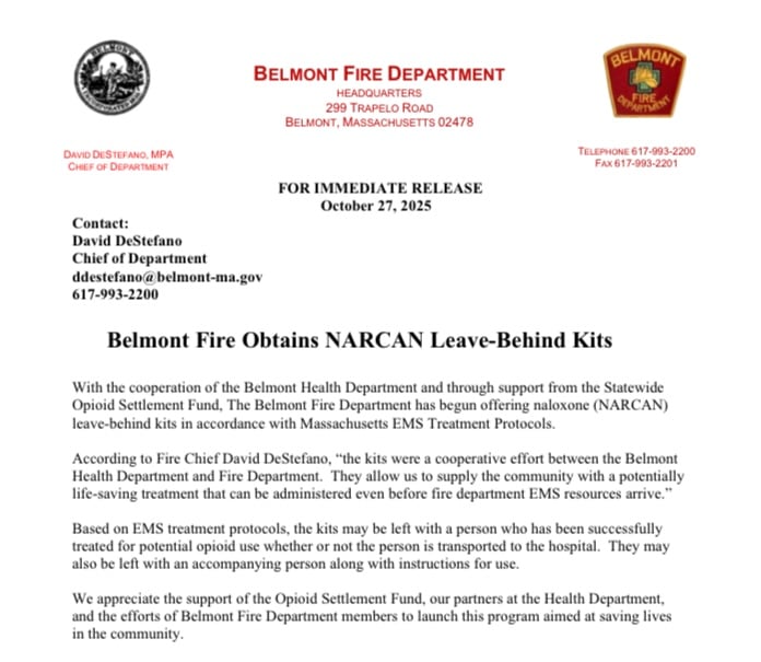 BELMONT FIRE OBTAINS NARCAN LEAVE BEHIND KITS