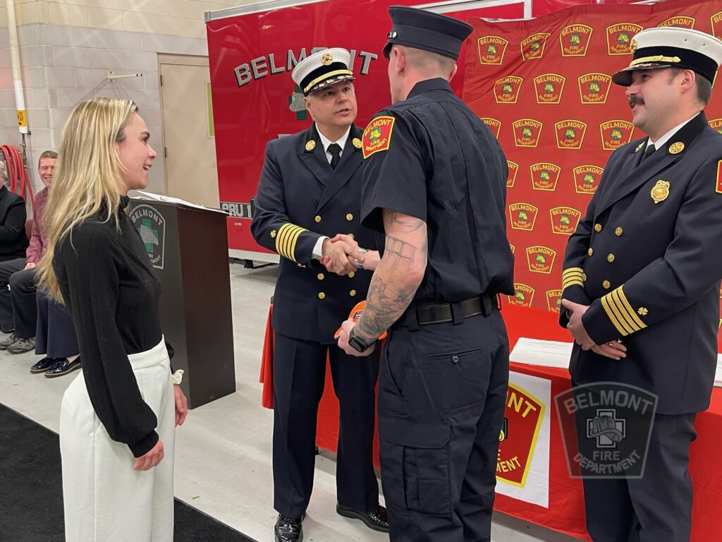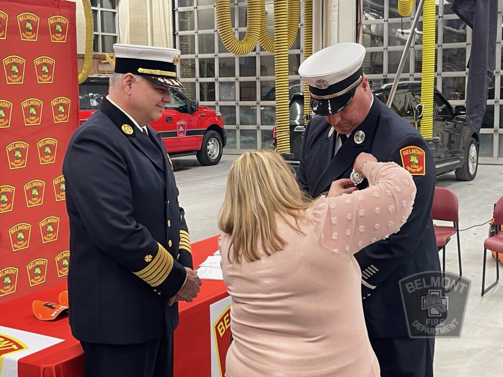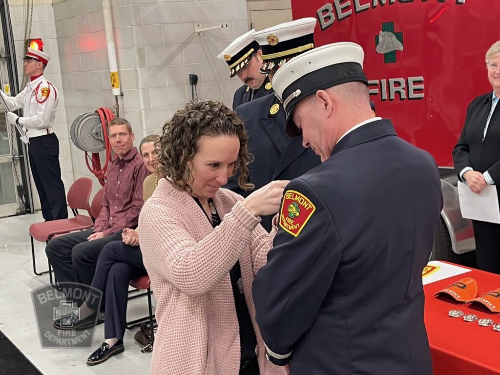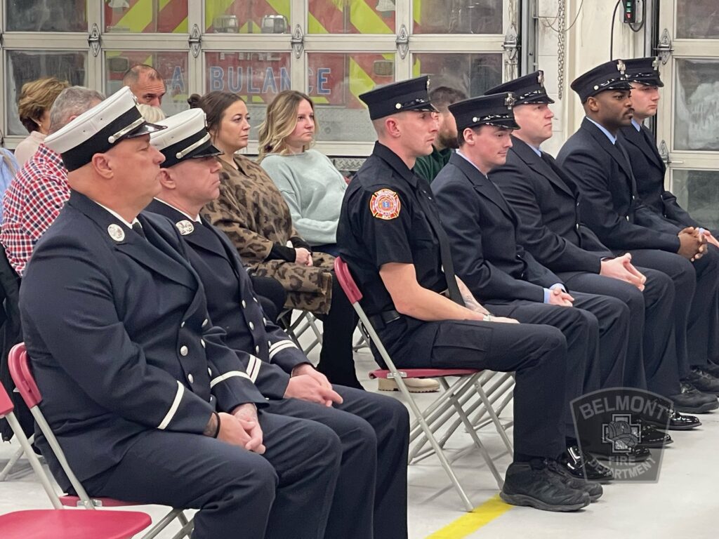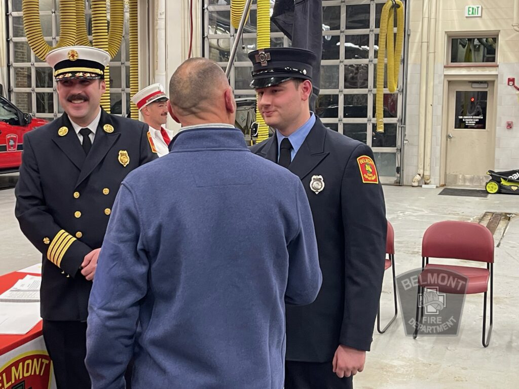 On Monday evening a badge pinning and promotional ceremony was held at fire headquarters. Michael Madruga was promoted to captain, and Dennis Maher was promoted to lieutenant. Additionally, our five newest firefighters received their badges and helmet shields. FFOP Brown, FFOP Heurtelou, and FFOP Ashline successfully completed the Massachusetts Firefighting Academy at the end of December. FFOP O’Riordan and FFOP Flodstrom come to Belmont with experience from other departments. Congratulations to everyone, stay safe!