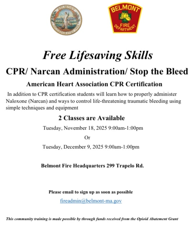 UPCOMING CLASSES BEING OFFERED – LEARN CPR, NARCAN ADMINISTRATION, AND STOP THE BLEED November 3, 2025| News Earn a CPR certification and lean other life saving skills with Belmont Firefighters. Screenshot Post navigation Previous Previous post: FALL BACK SAFELY – CHECK YOUR ALARMSNext Next post: MBTA ELECTRIC BUS TRAINING